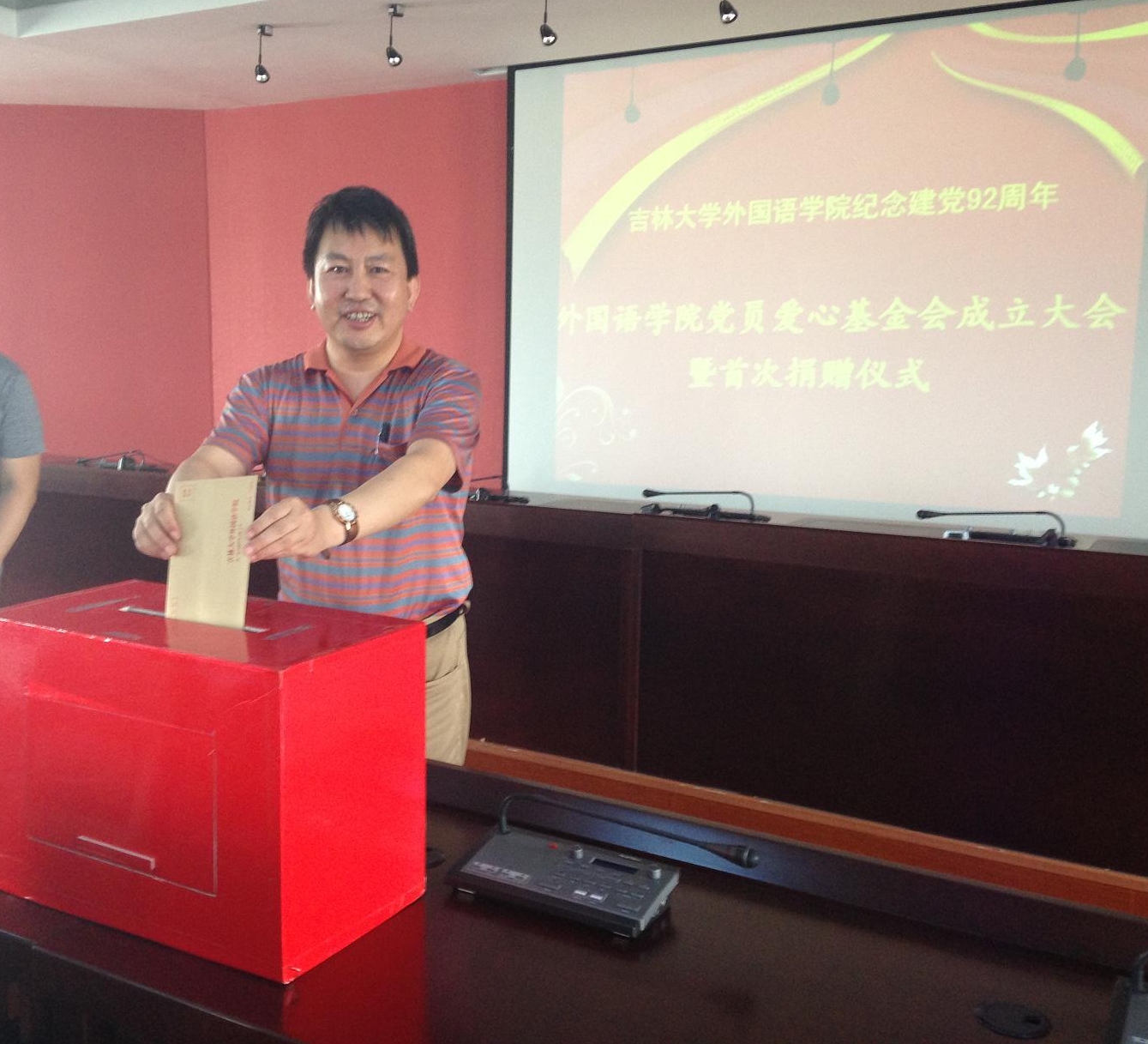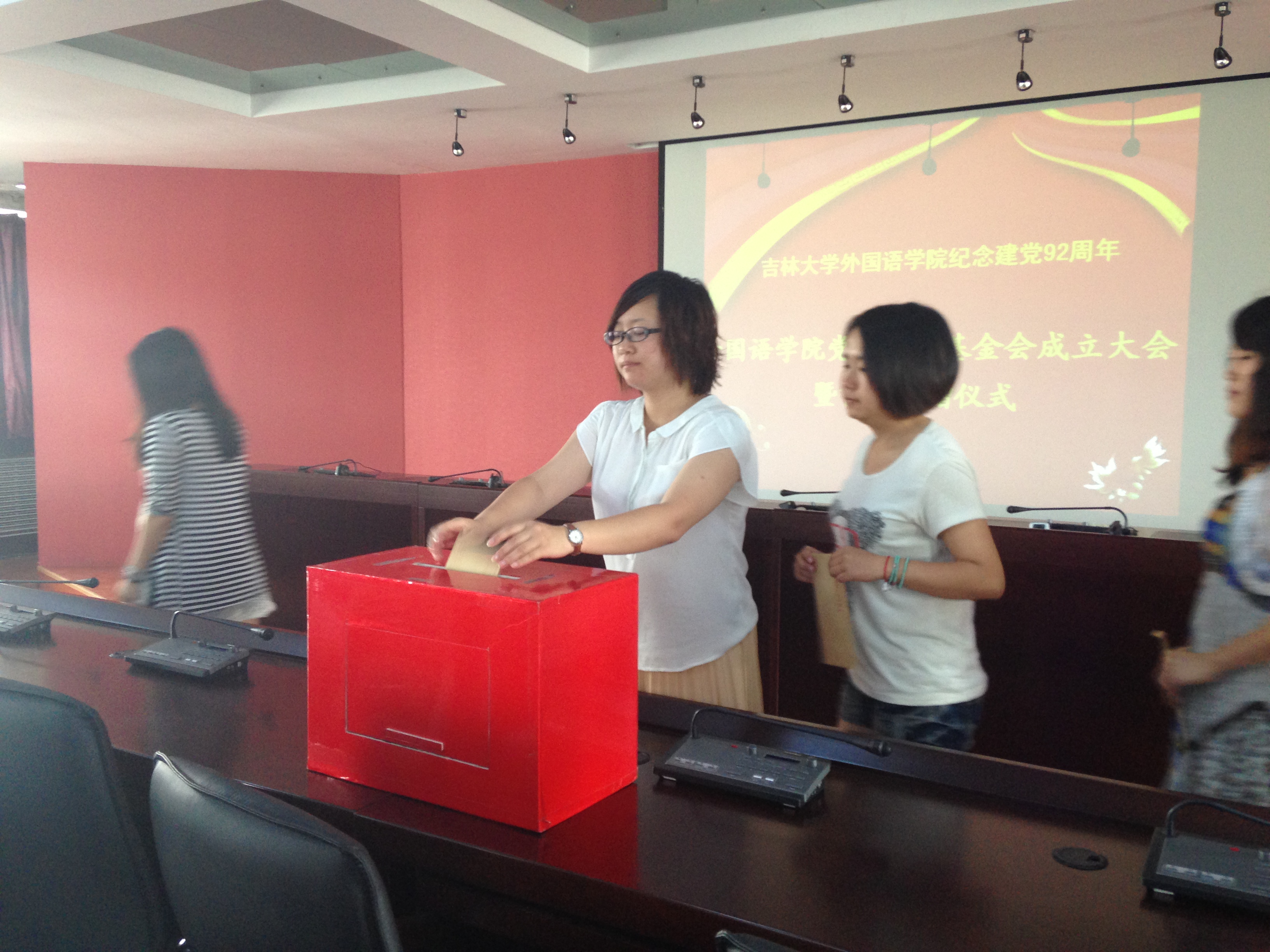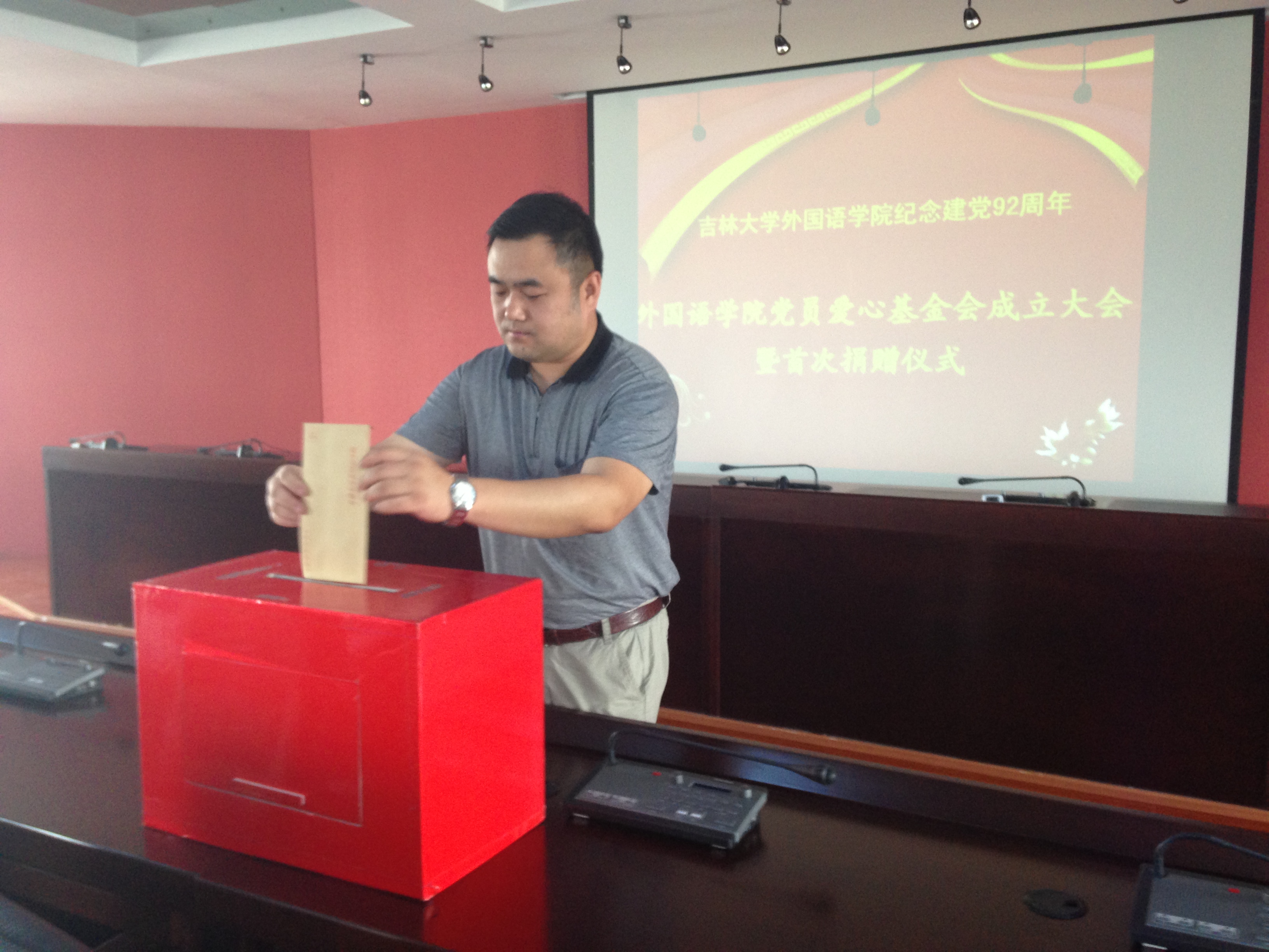 然后,毕业生党员爱心基金启动仪式正式开始。逄书记和白书记带头走上前,首先将自己的爱心放入捐款箱内。随后,毕业生党员纷纷上台献出自己的爱心。