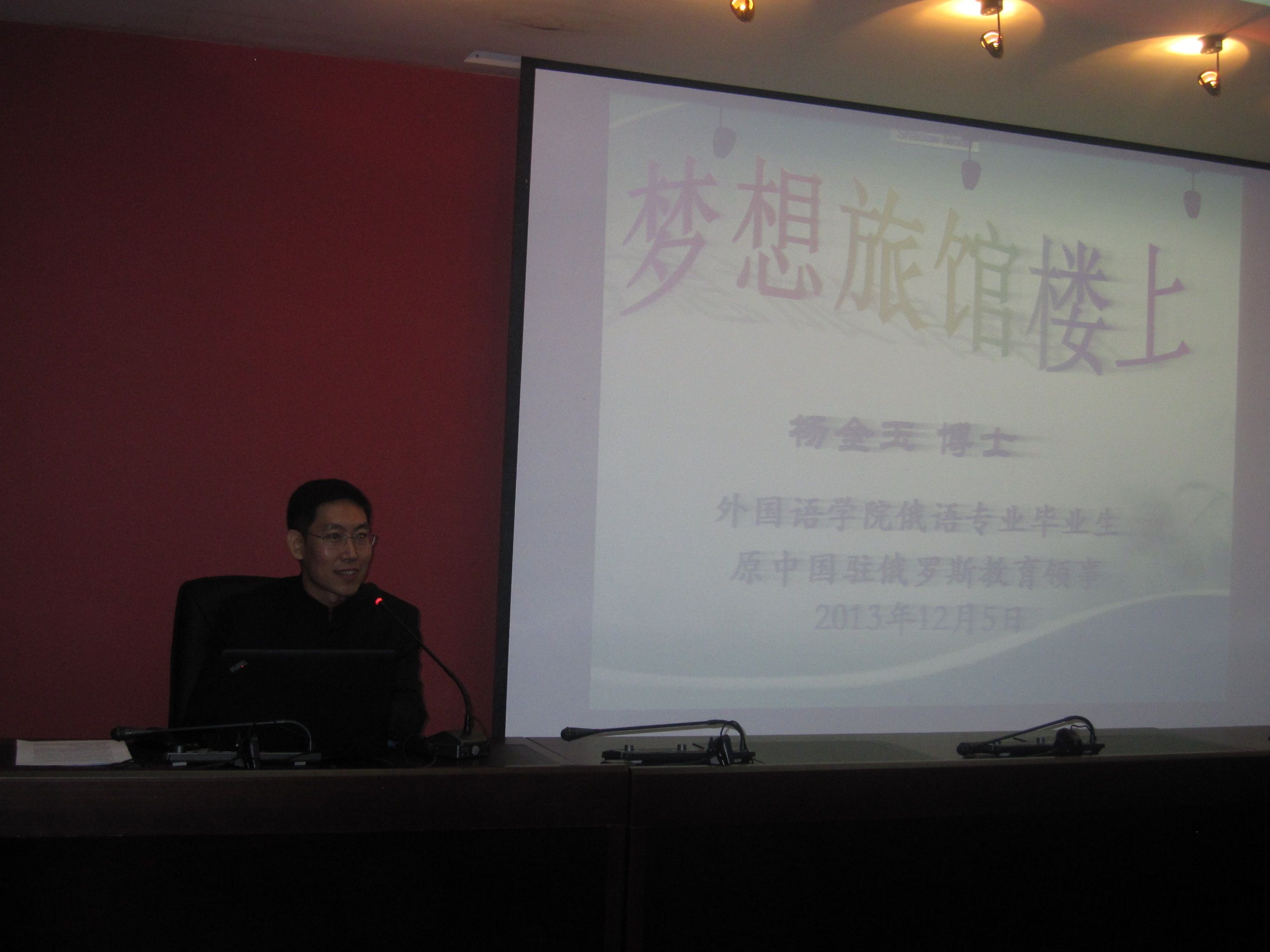 1998届俄语专业毕业生、原中国驻俄罗斯教育领事杨金玉博士在外语楼501会议室为同学们带来《梦想旅馆楼上》。成人导航