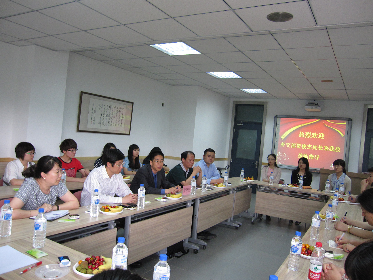尹允镇副院长、周异夫副院长、苗幽燕副院长、白宇副书记以及各系主任、副主任、支部书记和教师代表参加了座谈。双方就外交工作需求什么样的外语人才,如何培养高素质、复合型、职业化的人才进行了充分交流。