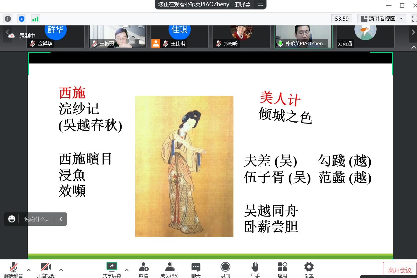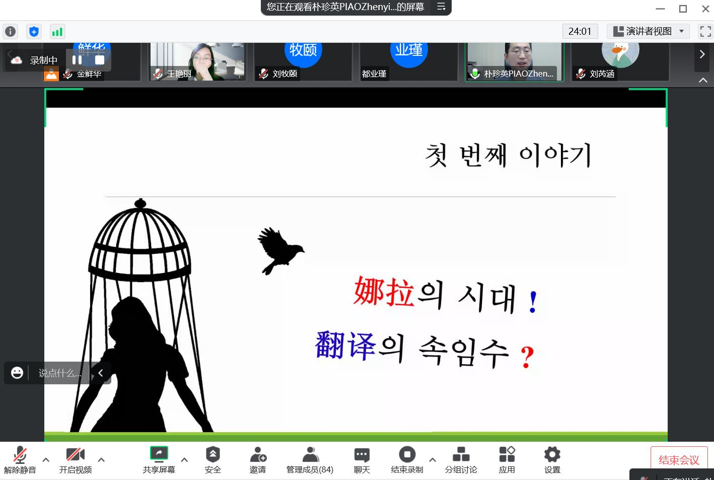 邀请,成均馆大学比较文化研究所长、成均馆大学国语国文学科朴珍英副教授在云端通过腾讯会议平台以“翻译与东亚女性”为主题进行了2个小时的学术讲座,讲座由朝文系教师王艳丽主持,参加讲座的人员有成人导航