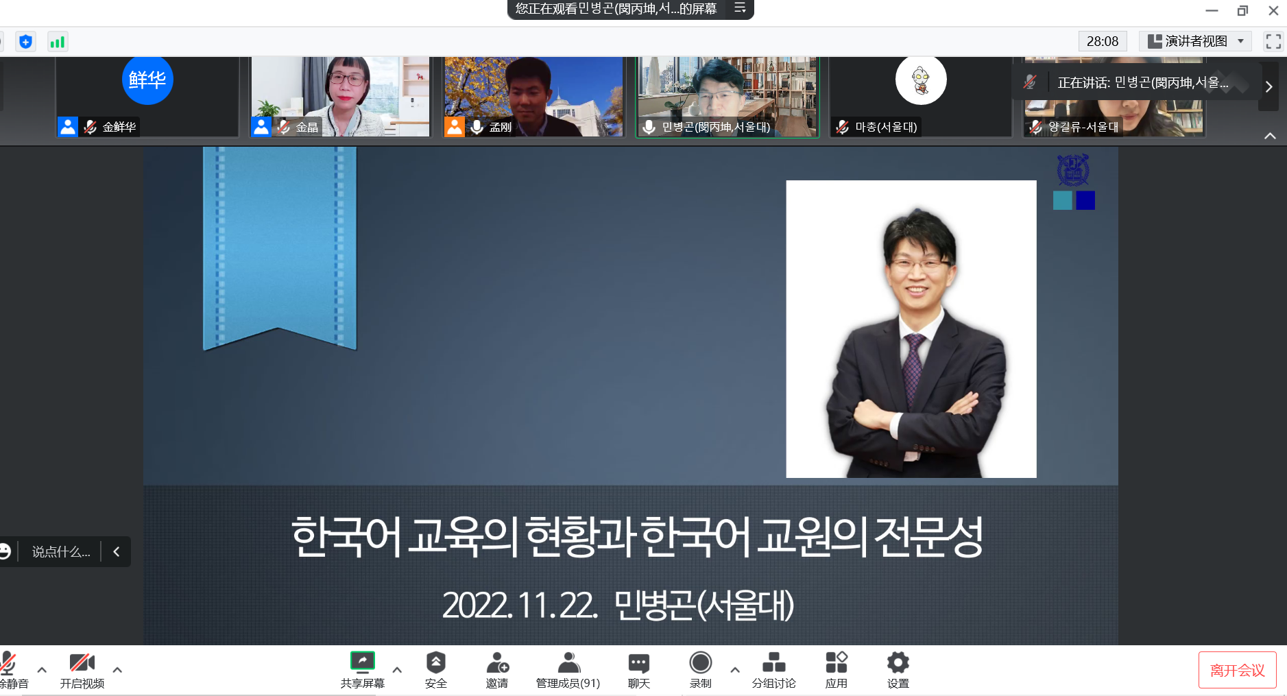 朝文系邀请,2022年11月22日19时,韩国语教育学会会长、韩国教育课程评价院研究咨询委员会委员长、首尔大学国语教育系闵丙坤教授通过腾讯会议进行了一场主题为“韩国语教育的现状与韩国语教师的专业性”的学术讲座。本次讲座由成人导航