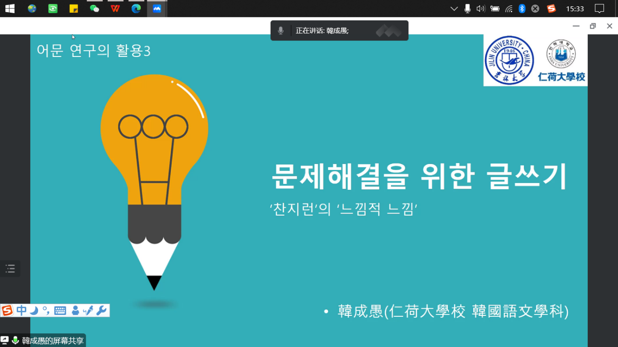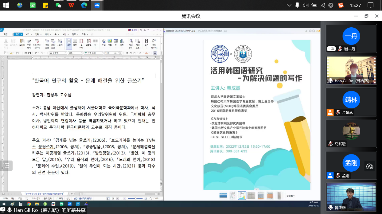 邀请,2022年12月2日15时30分,首尔大学国语国文系博士、韩国仁荷大学韩国语学专业教授、博士生导师、文化放送(MBC)韩国语委员会委员、2016年朝鲜日报作家奖获得者韩成愚老师在云端通过腾讯会议平台做了一场主题为“活用韩国语研究——为解决问题的写作”的学术讲座,讲座由朝文系外教韩吉路老师主持,参加讲座的人员有成人导航