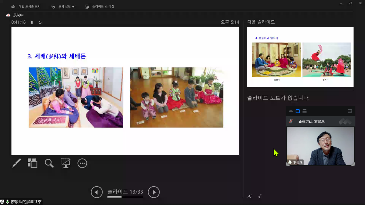 罗景洙教授精心准备了本次讲座。本次讲座主要从礼仪、游戏、饮食等为代表的岁时风俗出发,从而更好地理解韩国的文化以及韩国人的生活方式和思考方式。随着传统的社会结构和文化基础指向新的方向,岁时风俗也在逐渐发生变化。本次讲座也指出要在理解韩国代表性节日和韩国固有的岁时风俗及其最近变化情况的同时,更要深入了解韩国人的生活文化。