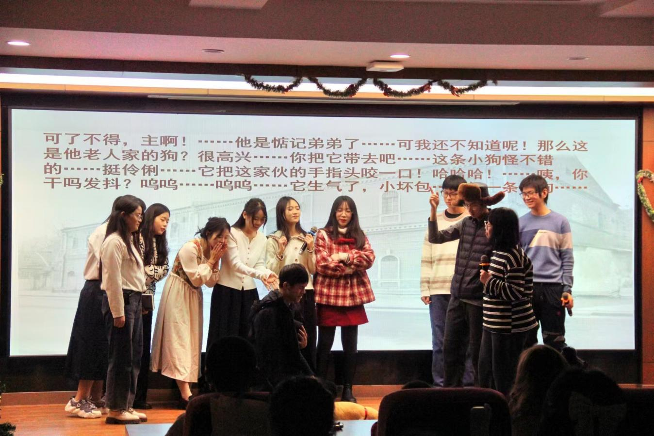 晚会开始,严寒老人和雪姑娘伴着自鸣钟悠扬的钟声走进会场,与晚会观众们热情互动,并分发新年礼物,点燃晚会现场气氛。本次新年联欢晚会,俄文系同学展现了高超的语言模仿能力、精湛的舞台表演功底,呈现了一台精彩纷呈的文娱晚会。影视配音节目中,孙悟空和妖怪的声音惟妙惟肖,游侠与地头蛇的语言透着火药味,后宫娘娘的语言充满宫斗心机;中国传统器乐独奏使人领略到中华民族乐器的魅力,俄语歌曲演唱使人在叹服歌者美妙的声音同时也深深沉浸于俄罗斯音乐之美;根据俄罗斯著名作家作品改编的舞台剧、根据校园生活创造的原创情景剧等节目,让现场观众不时发出会心的笑声。中场游戏环节更是将整个晚会现场气氛推向高潮,所有人都积极参与游戏,现场为获胜者准备了精美奖品,并为所有参与者准备小礼品,增加了晚会的趣味性和互动性。