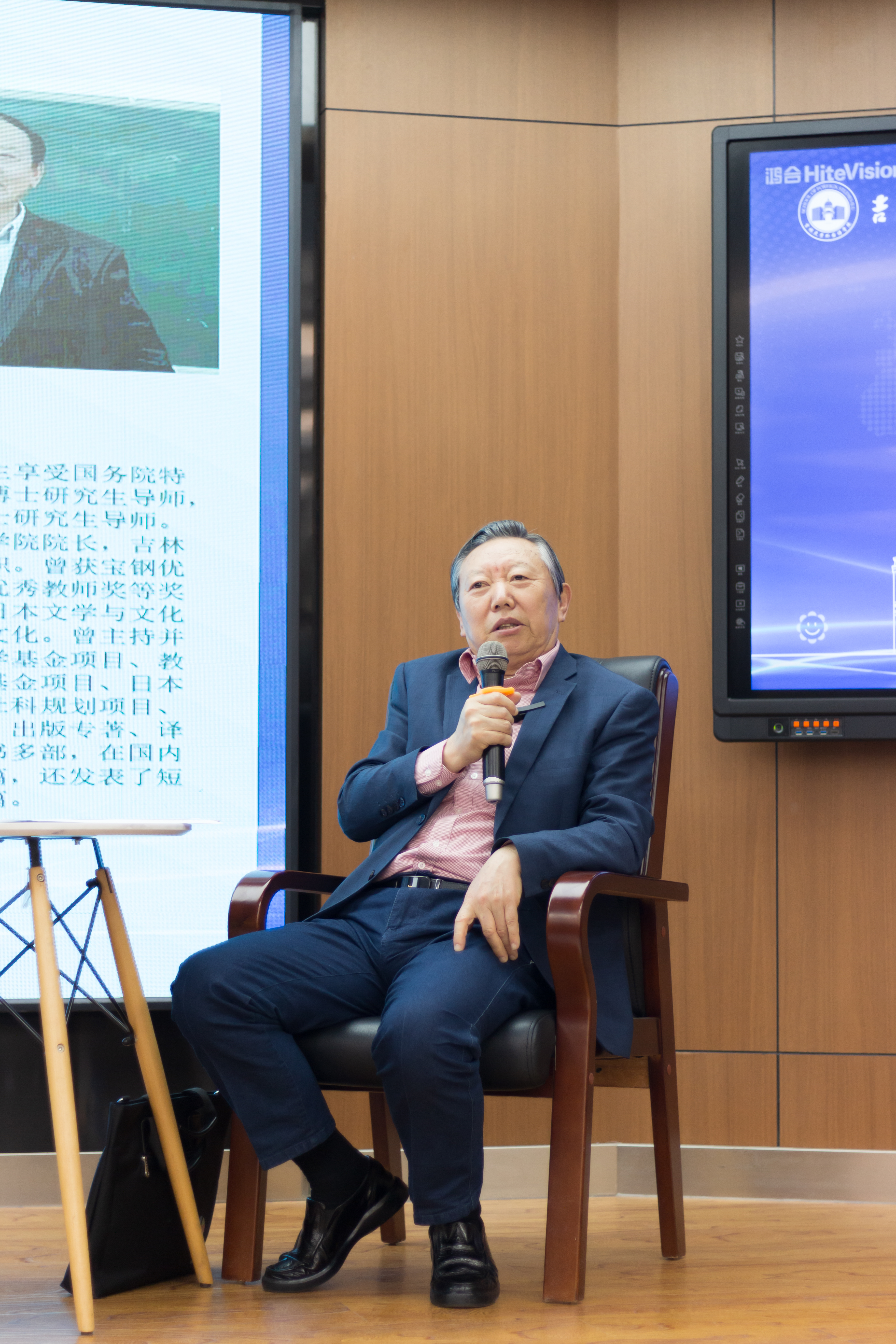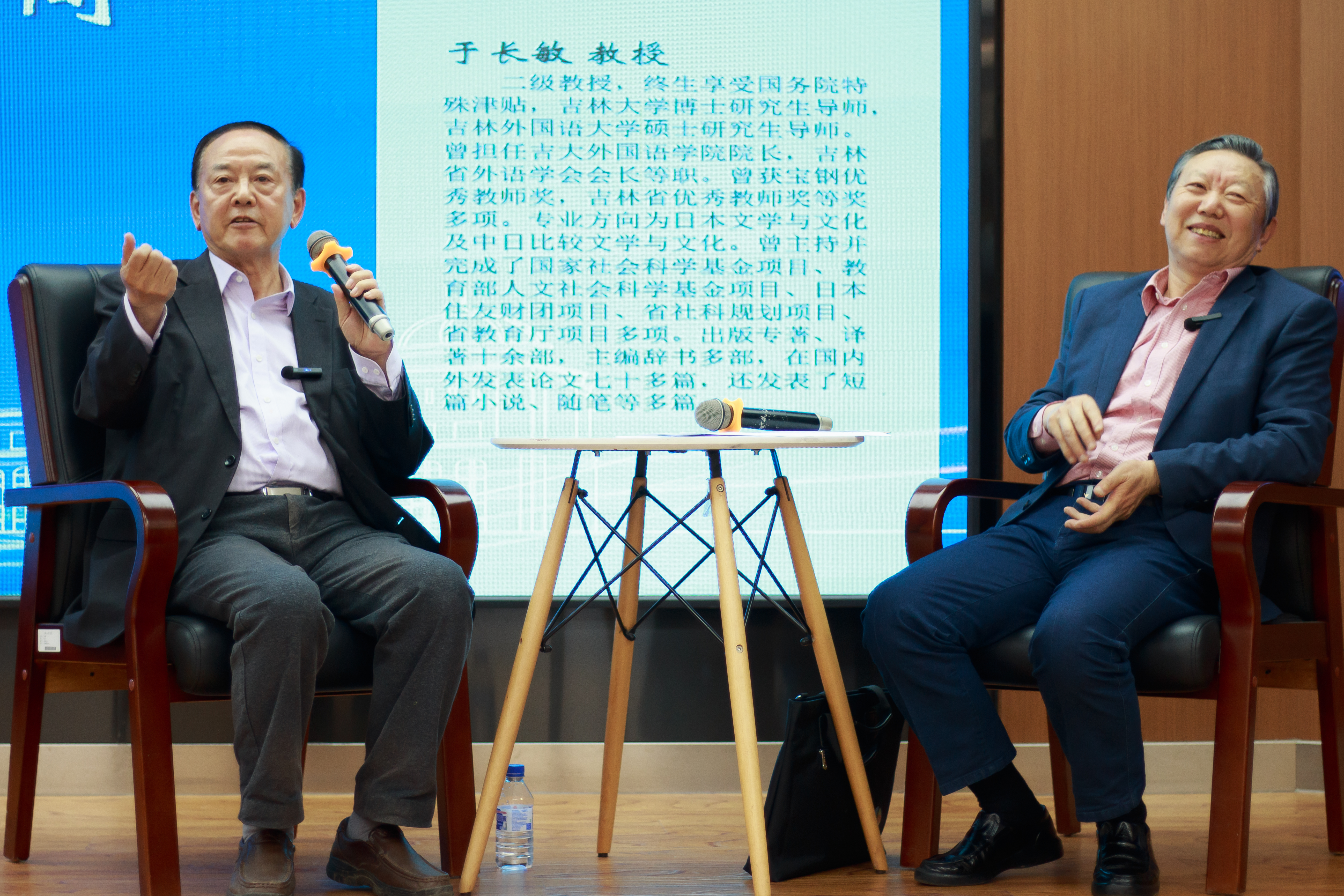 副院长房颖老师主持。两位名师以《文学翻译:外译与中译之间》为题开展了高水平探讨。于长敏教授广引实例,强调了在汉译日场景中汉语水平、日语水平以及对文化背景知识的深入掌握三者缺一不可。林少华教授则以日译英为对照组,分析了中国译者在日译汉场景中的优势与劣势,强调了译本中艺术情韵的重要性。面对当今AI技术给翻译行业带来的冲击,两位教授均表示AI未来虽可做到“信”和“达”,但难以在“雅”的层面超越人类,完全取代人工文学翻译。